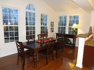 Inside of the home and starting slowly to decorate !! Waiting on a rug for under the table and we have different matching lamps ( I will have to get a new pic with them ) They are lower profile so windows can be seen more !We also bought some leather counter height stools for island.. will post more pics later !!